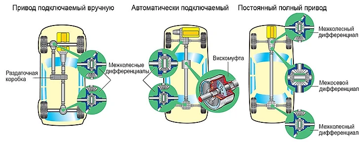 • «раздатки», предусматривающие жесткое переключение ведущих мостов;