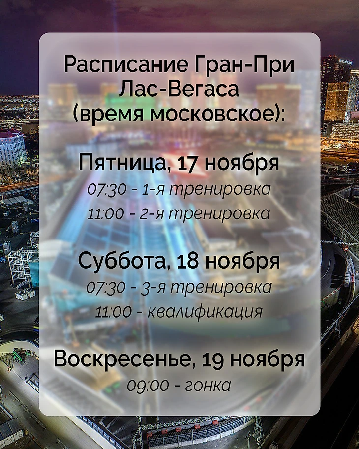 Не отстает от климатических показателей и фактор времени. Для того, чтобы уменьшить влияние этапа на жизнь обычных граждан в Лас-Вегасе, заезды сдвинули на максимально позднее время. Квалификация начнется в полночь субботы по часам столицы казино, а гонка впервые с 1985 года получит старт вечером субботы. Любая пауза по ходу основного заезда приведет к уникальному явлению - Гран-При Лас-Вегаса станет первой гонкой в истории, прошедшей по ходу двух разных дней. Жалко в этой ситуации пилотов. Мало того, что им придется бороться с шинами при аномальных температурах, так еще и выступать по ночам. А ведь на их плечи ложится не только пилотирование болидов, но и пресс-конференции, встречи со спонсорами и пресловутое предстартовое шоу. Конечно, гонщики - суперпрофессионалы, но сохранить концентрацию в подобных условиях и верно распределить силы будет сложнее, чем на иных гонках сезона.