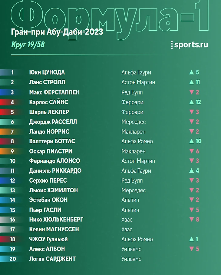Борьба в общем зачете продолжается. И теперь более выгодным кажется уже положение «Мерседеса». Расселл постепенно догоняет Леклера, Хэмилтон тоже в очковой зоне. А вот Сайнс пока лишь 15-й (успешно обогнав Хюлькенберга) и прорываться ему еще довольно долго. Правда, на стороне Сайнса финальный отрезок на «медиуме».