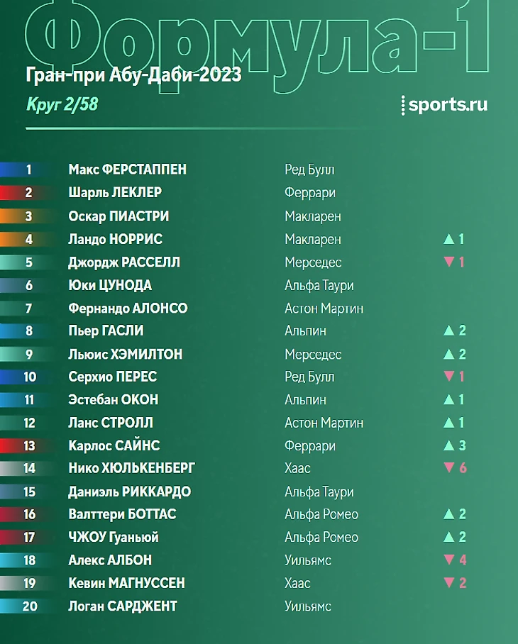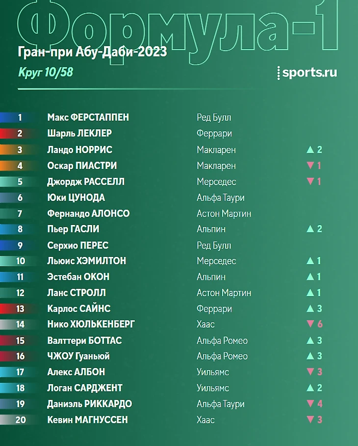 Нет, в «Феррари» решили не рисковать - Леклер отправляется в боксы на следующем же круге. И возвращается на трассу позади Ферстаппена. Ну, теперь посмотрим, сколько продержится Сайнс.