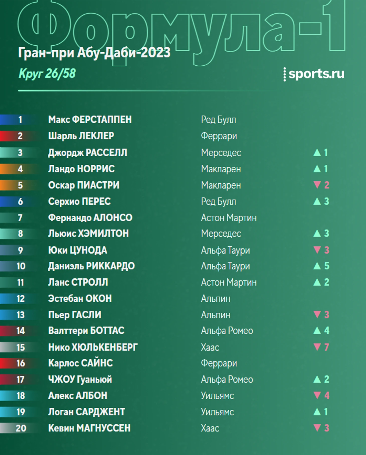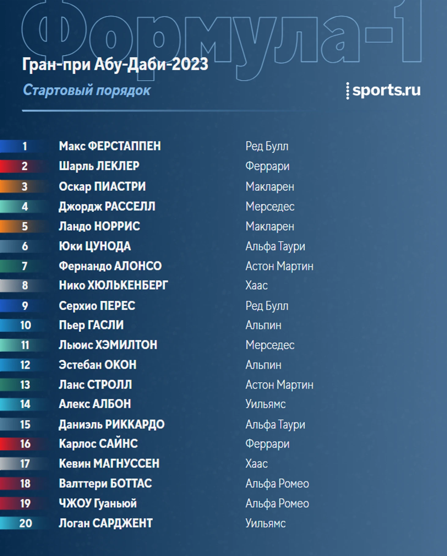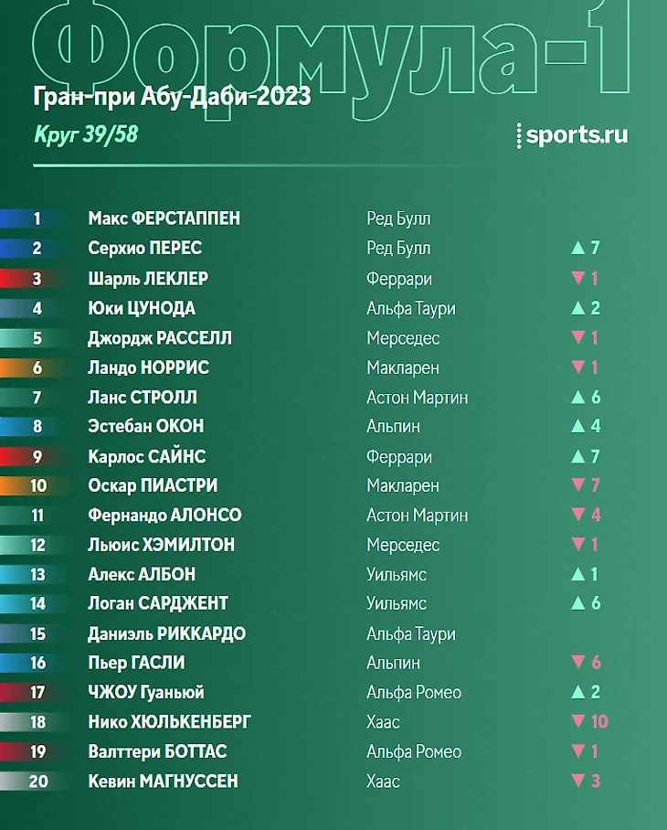 Спасибо, что были с нами! Теперь увидимся в онлайнах в следующем году - сезон-2024 стартует 29 февраля на Гран-при Бахрейна! А до этого там же пройдут предсезонные тесты.