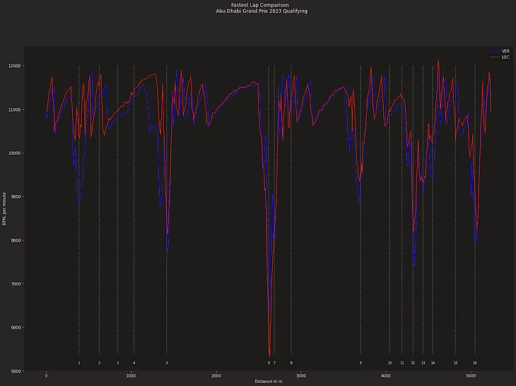 По оси у- отложены обороты которые развивал двигатель каждого гонщика, по оси х - отложена дистанция трассы. Вертикальными линиями показаны номера соответствующих поворотов. Синим цветом показан график - Макса Ферстаппена, а красным соответственно Шарля Леклера.