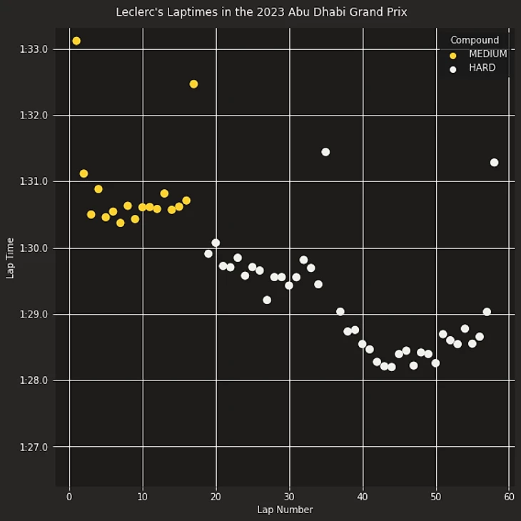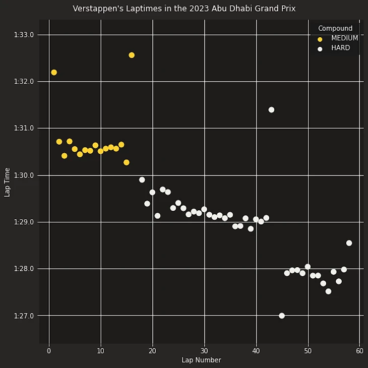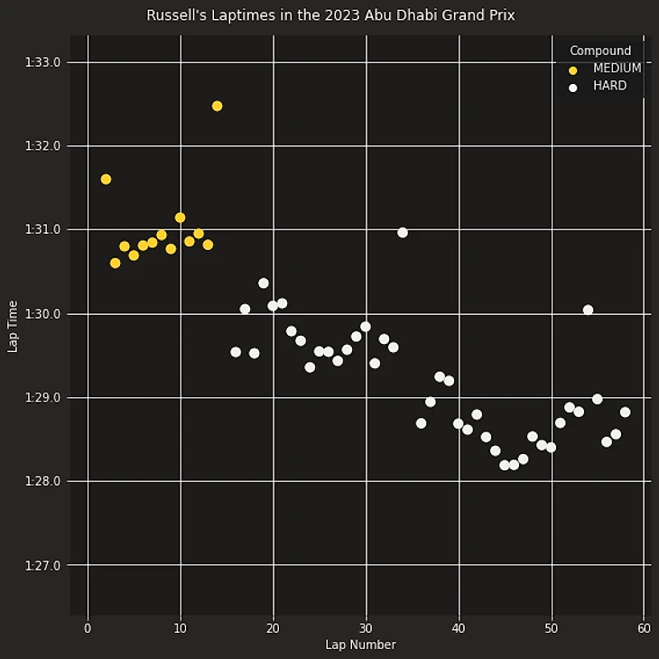 По оси х отложены круги гонки, по у - время гонщика. Цвет кружочка отражает типы шины: желтый - медиум, белый хард.