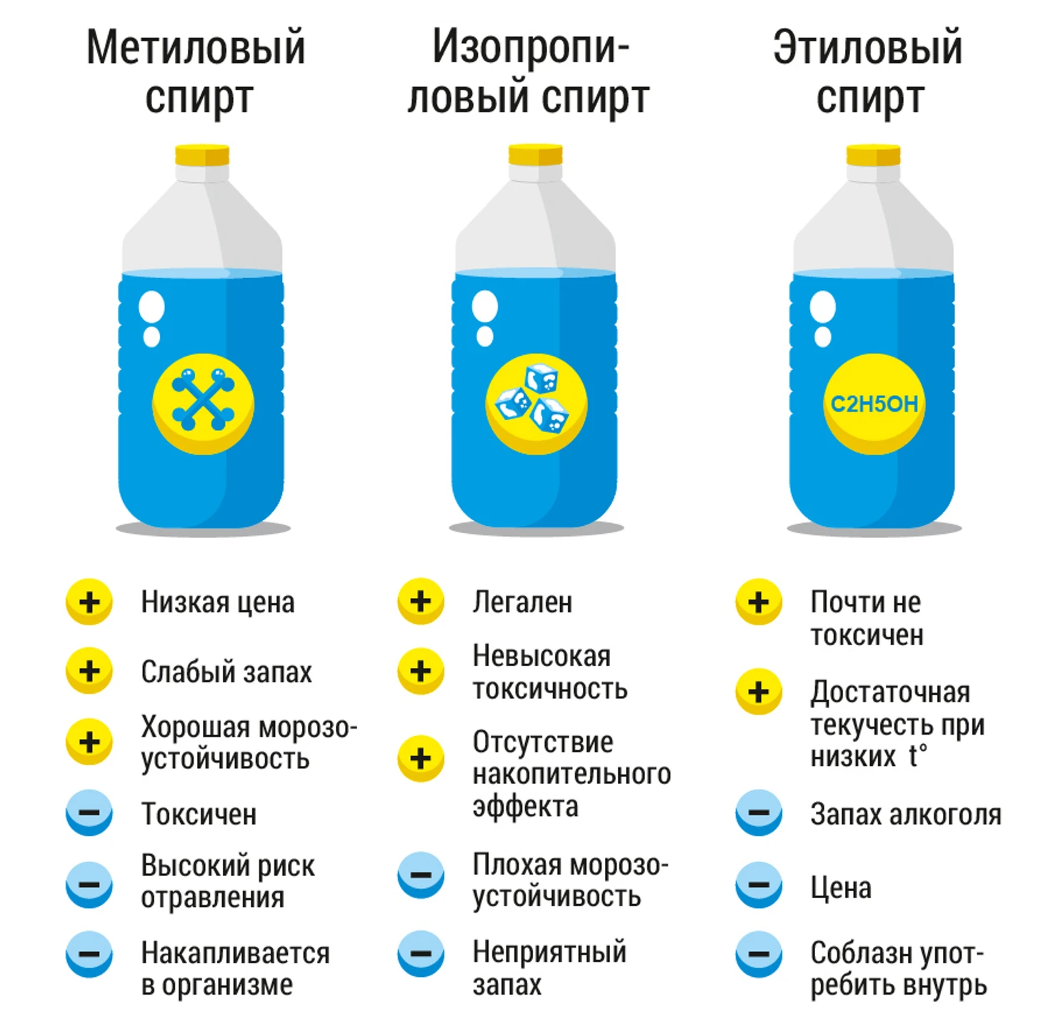 Преимущества изопропилового спирта в его дешевизне относительно этанола и безопасности по сравнению с метанолом. Поэтому практически вся производимая незамерзайка выпускается на основе изопропанола. Но есть у этого спирта и недостатки. При падении температуры резко повышается его вязкость. К тому же изопропанол обладает неприятным запахом. Его заглушают ароматизаторами, которые в свою очередь могут вызывать аллергию у находящихся в автомобиле людей. Плюс ко всему изопропанол хуже отмывает загрязненные поверхности. Чтобы устранить этот отрицательный момент, изготовители омывающей жидкости включают в ее состав различные добавки с моющими свойствами и ярким ароматом. А это значительно влияет на стоимость выпускаемой продукции.