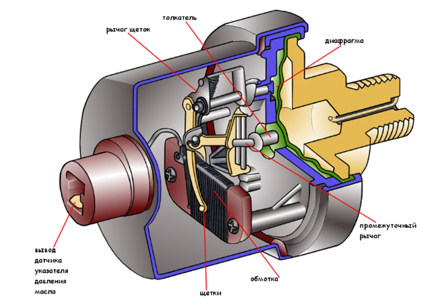 Датчики давления масла встречаются двух видов: аварийный и контрольный, который есть не во всех автомобилях. Именно первый зажигает красную лампочку с пиктограммой при нулевом давлении в масляной системе. Конструкция датчика масляного давления несложная и состоит из четырех основных элементов: собственно корпуса, толкателя, мембраны и электрических контактов.