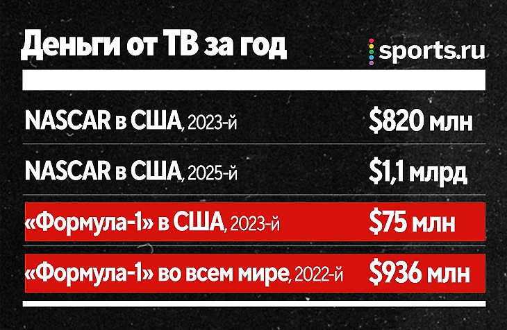 В 2023-м NASCAR еще работал по старому соглашению на 820 миллионов. Для «Формулы-1» показатели за последний год опубликуют только в январе-феврале с финансовым отчетом, но в 2022-м она насобирала по всему миру 936 миллионов – с учетом собственного стриминга.