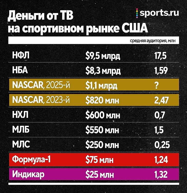 До недавнего времени так и было. А потом главная серия США NASCAR договорилась о распределении теле- и медиаправ с 2025-го по 2031-й среди Fox Sports, NBC, Warner Bros. Discovery, Amazon и CW. Сумма сделки – $7,7 миллиарда долларов, или $1,1 миллиарда в год.