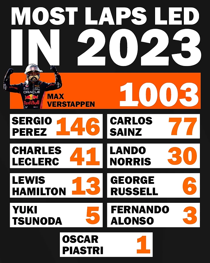 Про 1000 и 3 круга лидирования в минувшем чемпионате Формулы-1 от Макса Ферстаппена все уже давно в курсе. Но знаете ли вы, кто ещё возглавлял гонки, помимо голландца, в сезоне-2023? Таких счастливчиков оказалось всего девять.