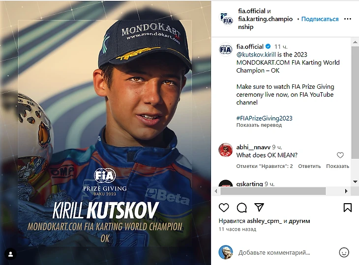В 2023-м ФИА Гала принял Баку. И среди награжденных оказался россиянин – чемпион мира по картингу в классе OK Кирилл Куцков, выступающий за команду Фернандо Алонсо!