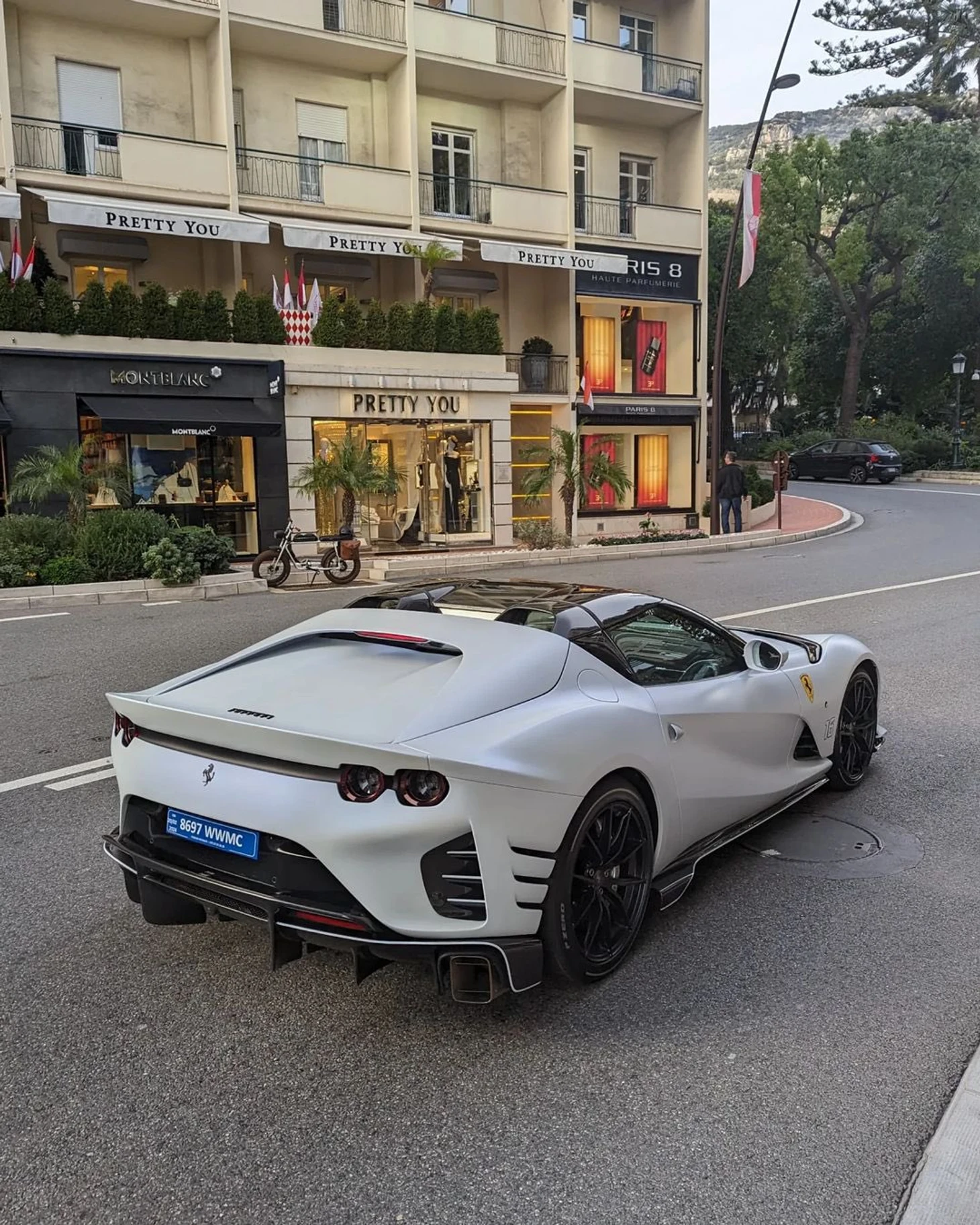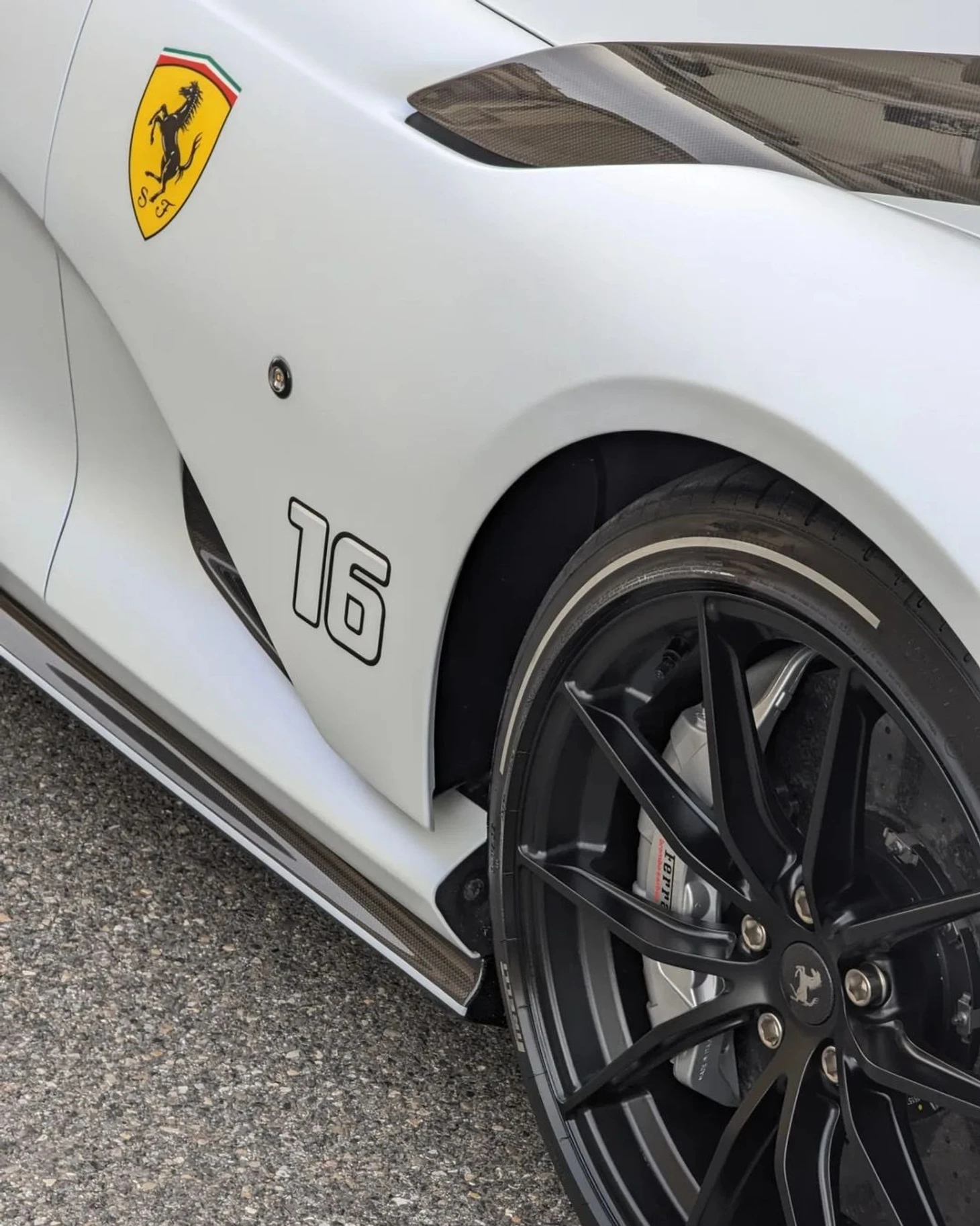 Это «Феррари» 812 Competizione – одно из последних творений на платформе V12 Berlinetta. Выпущен тиражом всего в 999 экземпляров – и Шарлю достался один из самых последних в серии, да еще и с личным оформлением и номером на крыльях.