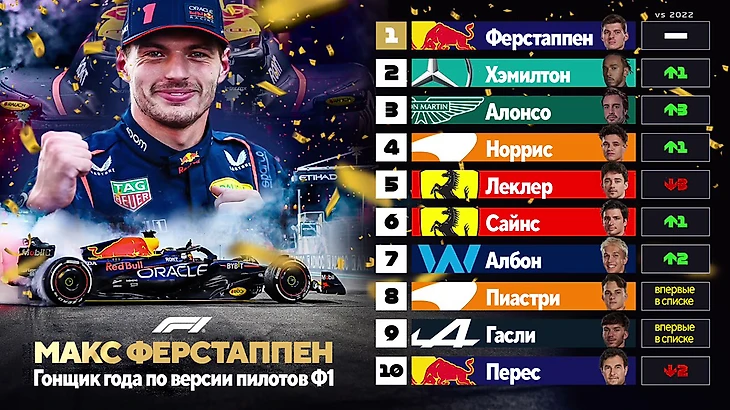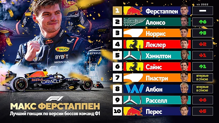 Алонсо взлетел на второе, Норрис стал №3, а Хэмилтона оценили пониже (видимо, помня о его титулах, зарплате и претензиях на роль лидера). Албон же внезапно впечатлил меньше Пиастри!