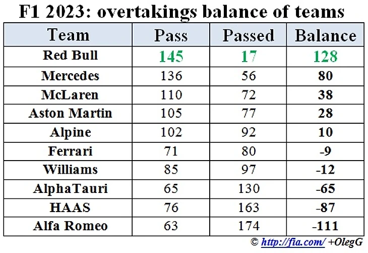 Не трудно догадаться, что в этой таблице по диагонали – «внутрикомандные» обгоны. Естественно, изменение позиций на трассе по указанию командного мостика, то есть без очевидной борьбы напарников по команде, в эту статистику не входят.