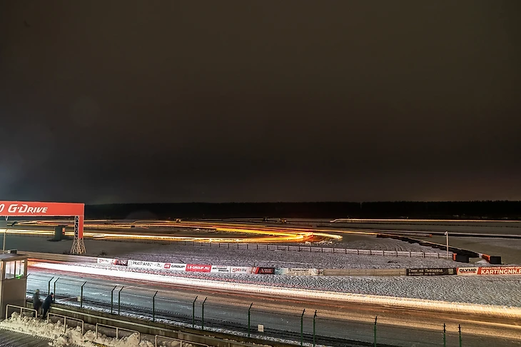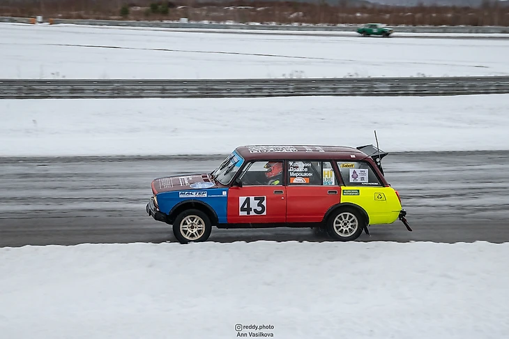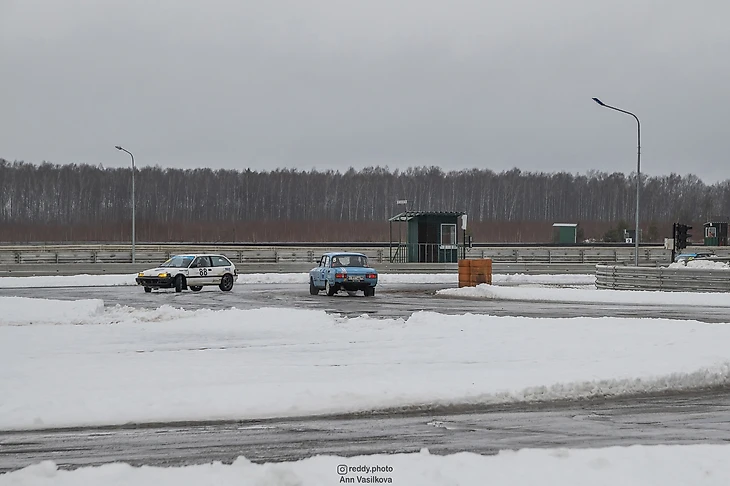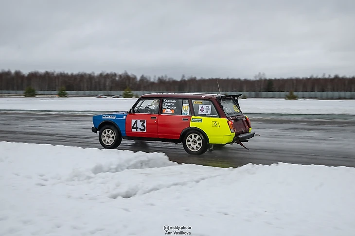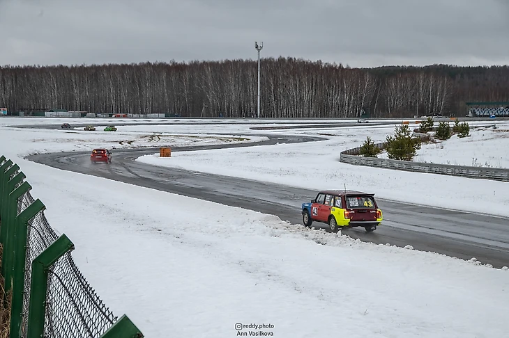 Мы, к счастью, причиной красных флагов более не становились, но и полноценно потренироваться из-за постоянных вылетов соперников тоже не смогли. Однако приехавшие накануне ночью Сева и Костя всё же успели попробовать трассу и новые для себя условия, мы немного поигрались с балластом (сначала в машине лежал довес в 200 килограммов, но к вечеру 50 кг сняли) и попробовали поехать на Мишлене, когда процентное содержание льда на трассе уменьшилось.