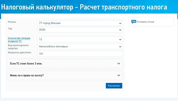 Рассчитать стоимость транспортного налога в вашем регионе можно с помощью справочного сервиса на сайте ФНС. Для расчета необходимо указать налоговый период, субъект России и вид ТС.