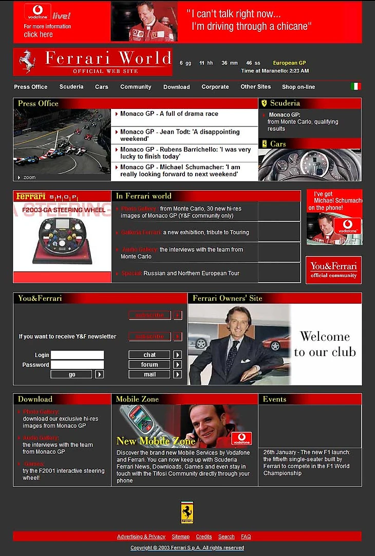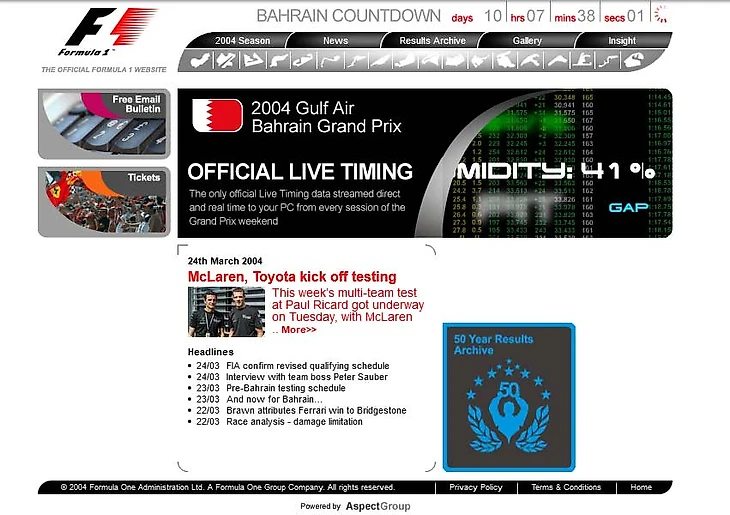 И да, тогда еще не было ютуба, стримингов и других солидных видеоплатформ. Соцсетей в нынешнем понимании еще тоже не было: никаких Twitter, запрещенные ныне в России сервисы одной синей компании только запускались, а сам домен Formula1.com принадлежал серии только второй год. Вот, кстати, как он выглядел 20 лет назад.