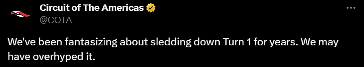 До этого снег на «Трассе Америк» видели только в конце 2017-го. Работники трека не упустили возможность исполнить свою мечту: «Мы годами фантазировали о том, чтобы скатиться с горки в первом повороте. Вероятно, мы переоценили эту затею».