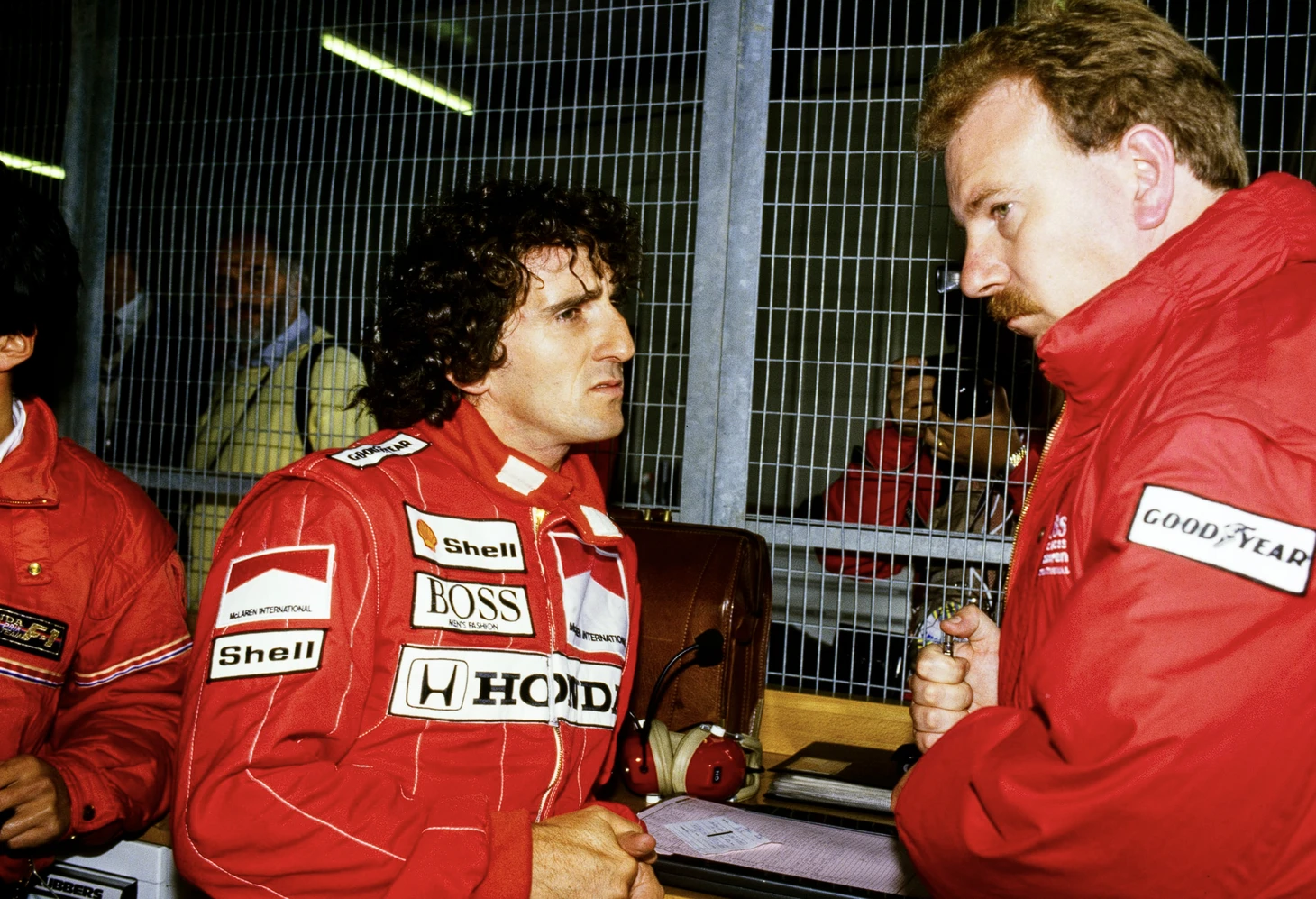 НО: Это было хорошо. Не было особого напряжения, особенно в 88-м году. Это была довольно дружеская атмосфера. Я работал с Аленом в предыдущем году над MP4/3. Впервые я встретился с Аленом на Гран-при Бразилии в том году. Рейс задержали, и мы прилетели только в четверг вечером, так что впервые я встретил его перед первой практикой.