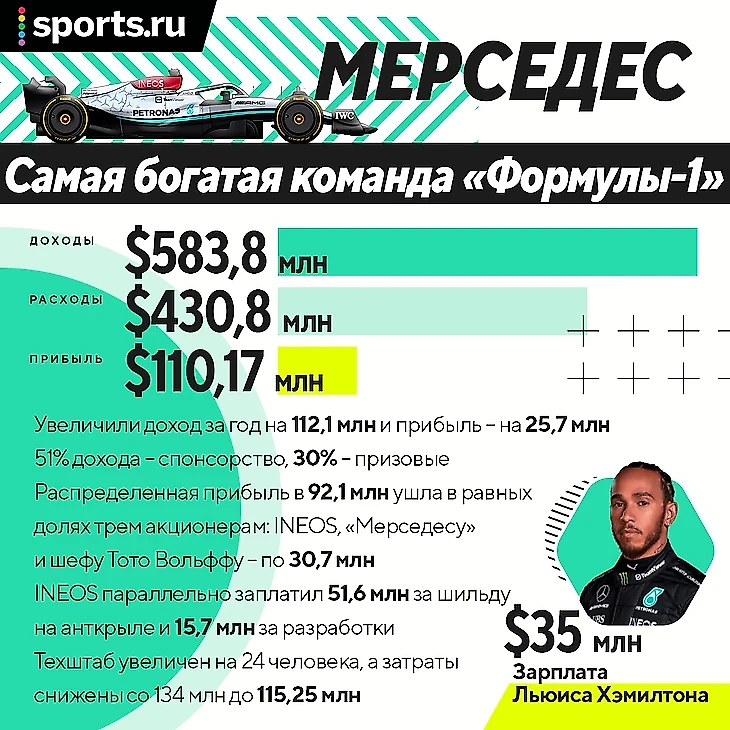 «Формула-1» – большой бизнес, а после внедрения потолка расходов он стал еще и прибыльным. «Мерседес» ощутил результат лучше и ярче всех – прямо сейчас восьмикратные чемпионы оказались самой зарабатывающей, богатой и доходной командой. Даже без побед, даже с потерями титула – за 2022-й они зафиксировали прибыль свыше 100 млн долларов. Это невиданная в старой «Ф-1» сумма.