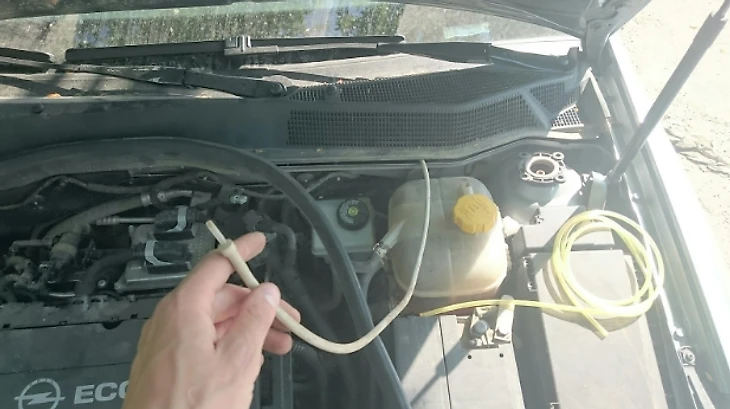 Снять шланг с хвостовой части форсунки. Возможно, при этом придется временно снять защиту от шума капота. Это стоит делать в тепле, поскольку при низких температурах шланги замерзают, деревенеют и трескаются.