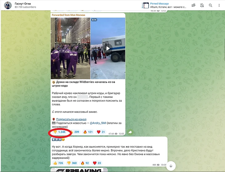 На эту новость также отреагировал российский комментатор Алексей Попов. В своем телеграмм-канале «Гаснут Огни» он опубликовал новость о драке на складе «Wildberries», с такой подписью «Ну вот. А когда Хорнер, как выясняется, примерно так же поставил на вид сотруднице, всё закончилось более мирно. Впрочем, дело Кристиана будут разбирать завтра. Чем закончится пока неясно. Но явно без Омона и массовых задержаний)». На данный пост люди отреагировали неоднозначно, о чем говорят реакции под данным постом.