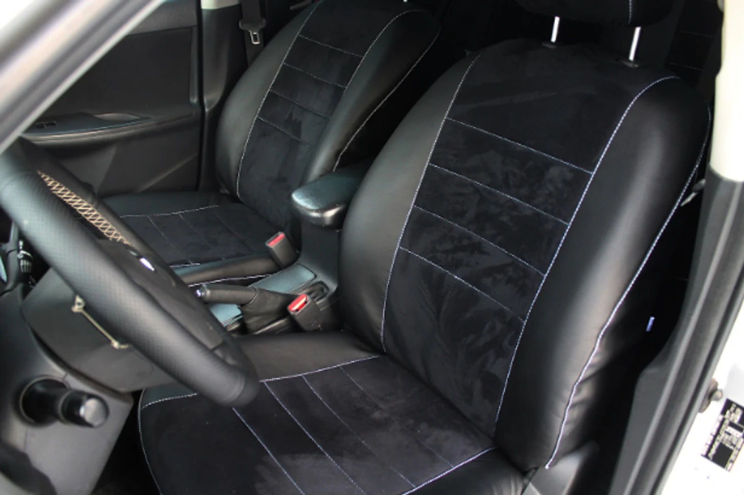 Если не устраивает экокожа, стоит рассмотреть покупку чехлов, сочетающих искусственную кожу с велюром или алькантарой.