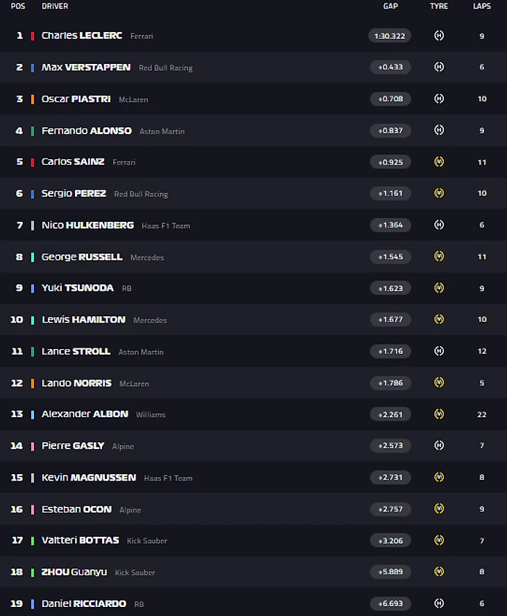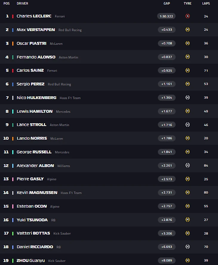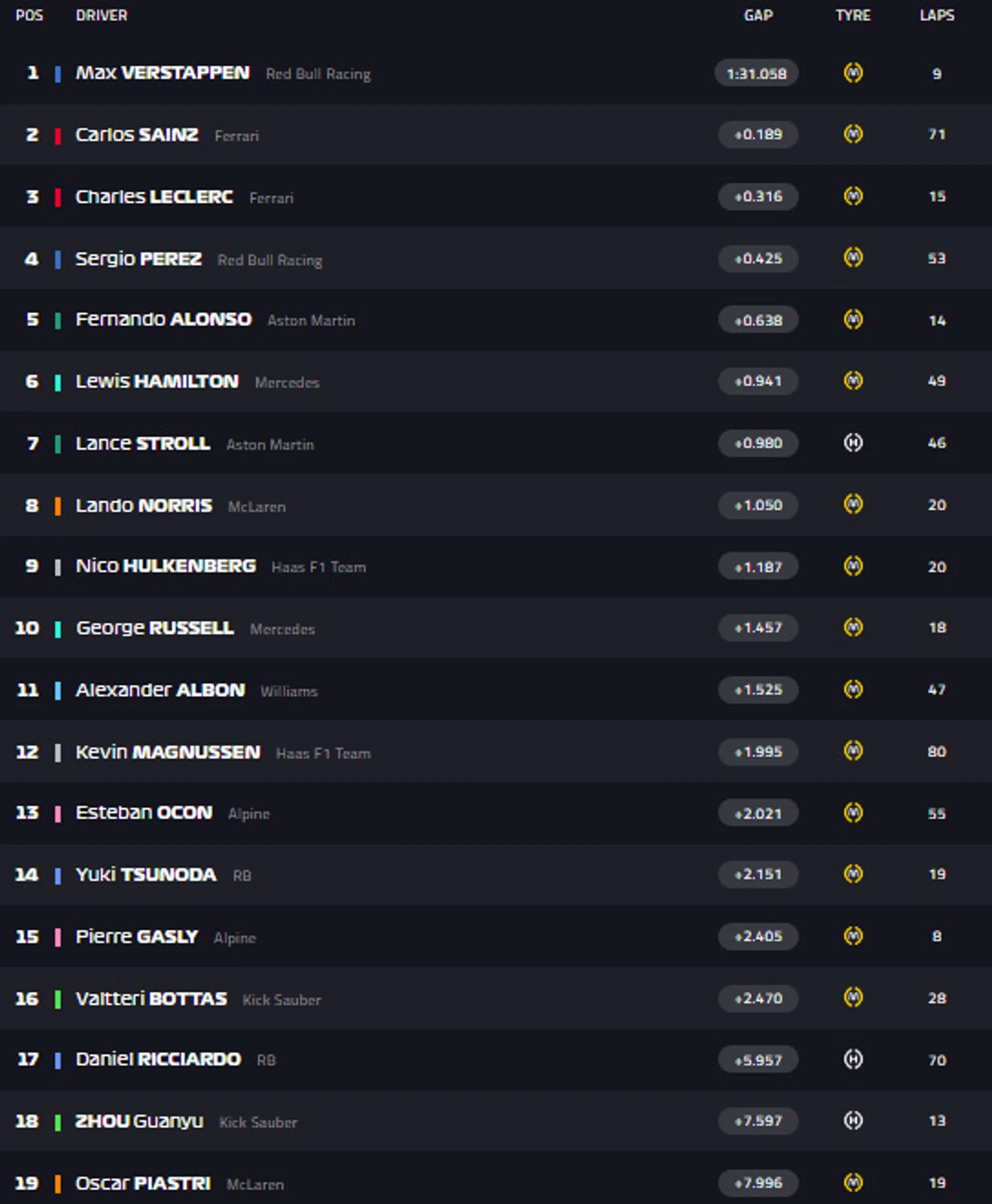 Леклер - первый, Макс - четвертый, Чжоу - третий... В общем, ждем первого этапа сезона. 1. Шарль Леклер («Феррари») 1.30,322, C5, 74 круга 2. Джордж Расселл («Мерседес») +0,046, C4, 67 3. Чжоу Гуаньюй («Заубер») +0,325, C4, 85 4. Макс Ферстаппен («Ред Булл») +0,433, C3, 66 5. Юки Цунода («РБ») +0,453, C4, 53 6. Алекс Албон («Уильямс») +0,662, C4, 121 7. Оскар Пиастри («Макларен») +0,708, C3, 91 8. Фернандо Алонсо («Астон Мартин») +0,837, C3, 75 9. Карлос Сайнс (»«Феррари») +0,925, C3, 71 10. Серхио Перес («Ред Булл») +1,161, C3, 53 11. Нико Хюлькенберг («Хаас») +1,364, C3, 89 12. Льюис Хэмилтон («Мерседес») +1,677, C5, 49 13. Ланс Стролл («Астон Мартин») +1,716, C3, 46 14. Ландо Норрис («Макларен») +1,786, C3, 20 15. Пьер Гасли («Альпин») +1,827, C3, 47 16. Кевин Магнуссен («Хаас») +2,731, C3, 80 17. Эстебан Окон («Альпин») +2,757, C3, 55 18. Валттери Боттас («Заубер») +3,206, C3, 28 19. Даниэль Риккардо («РБ») +6,693, C1, 70