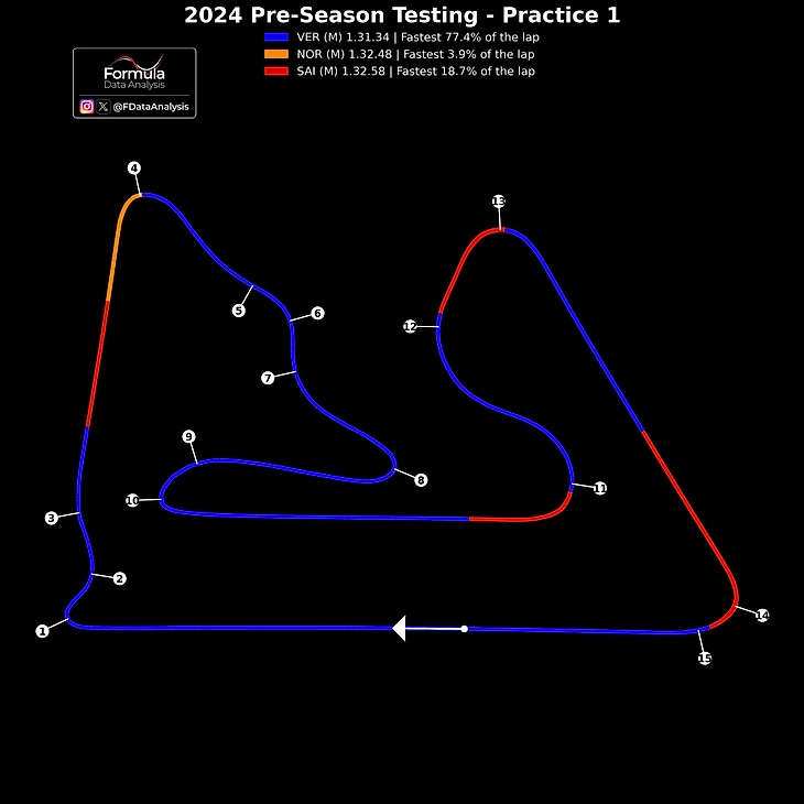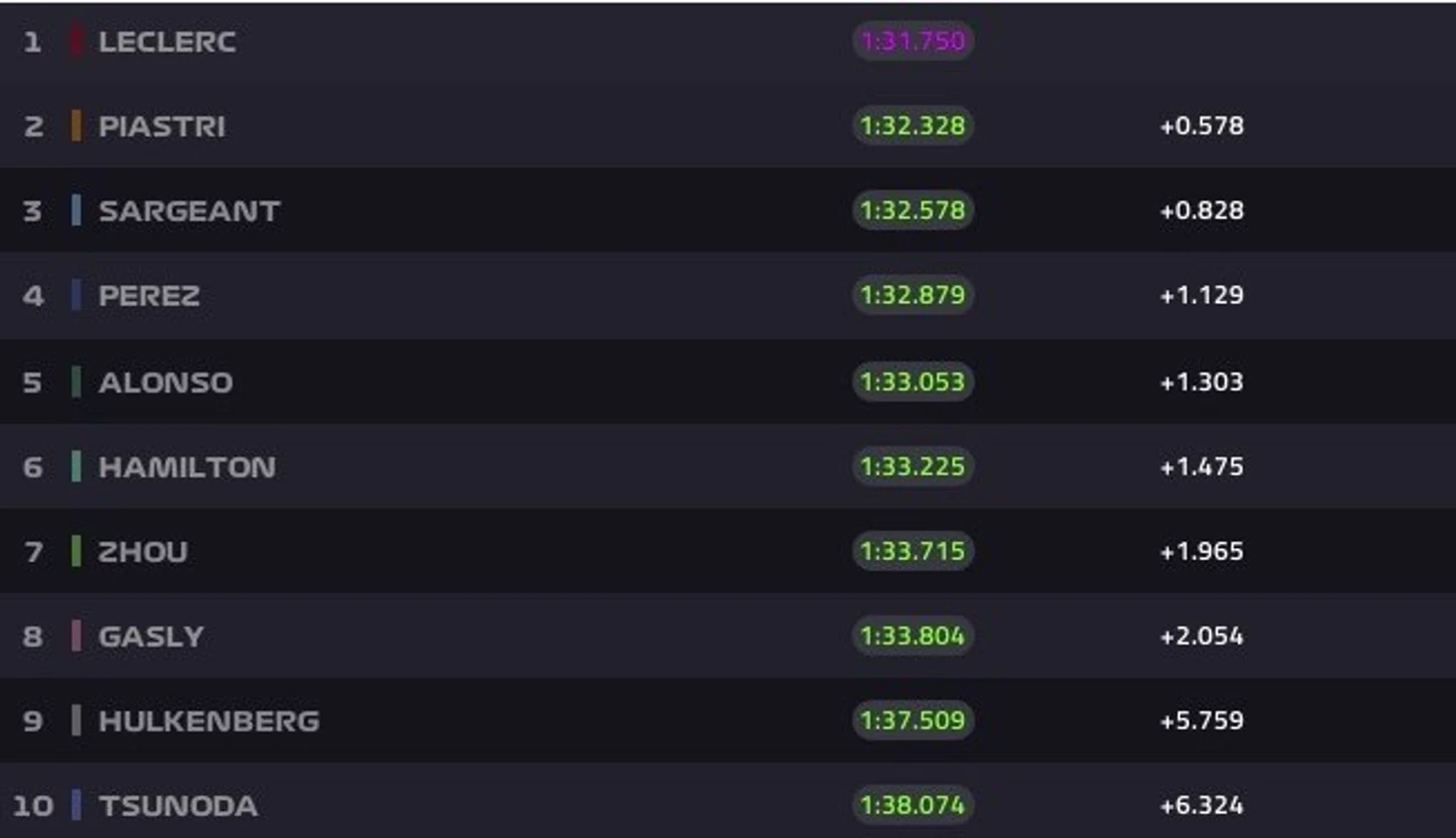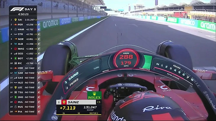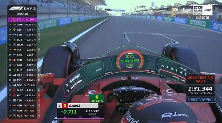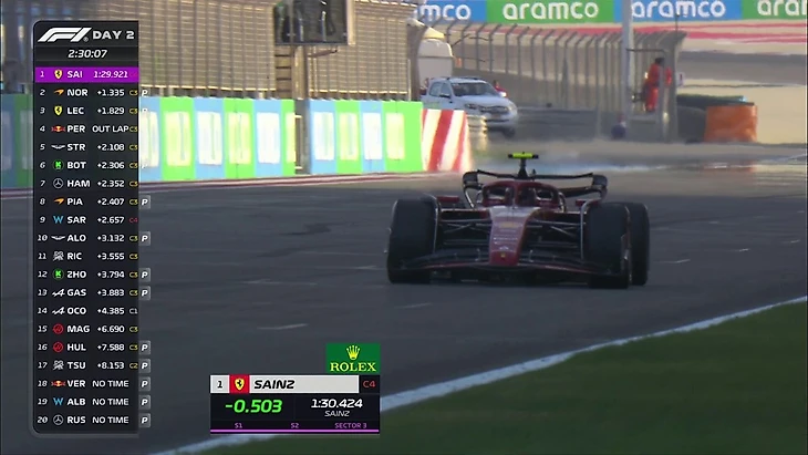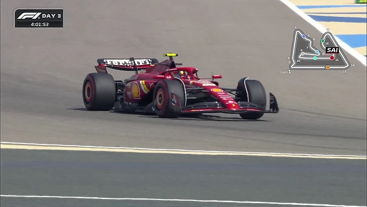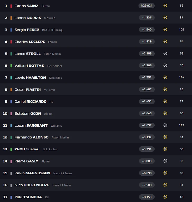 Завершился третий час дневной сессии, и вот промежуточные итоги. Сайнс не просто поставил лучшее время этих тестов, но и превзошел лучший результат 2023-го, который принадлежит Чеко Пересу - 1.30,305.