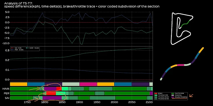 Еще немного из анализов вчерашнего дня - от Racing Telemetry. На инфографике показано, как работали с педалями Сайнс, Хэмилтон и Перес на участке с 5-го по 7-й поворот. Главное: Карлос и Льюис во время торможения также использовали газ (фиолетовый цвет), пока Перес полностью давил на тормоз (красный). Зачем? Так они старались сохранить баланс в задней оси, добиться лучшего сцепления сзади - то есть ни Сайнс, ни Хэмилтон не были уверены в стабильности задка. Перес же, судя по данным, чувствовал себя комфортно. Вывод: у «Ред Булл» все еще больше сцепления в высокоскоростных поворотах, чем у конкурентов.