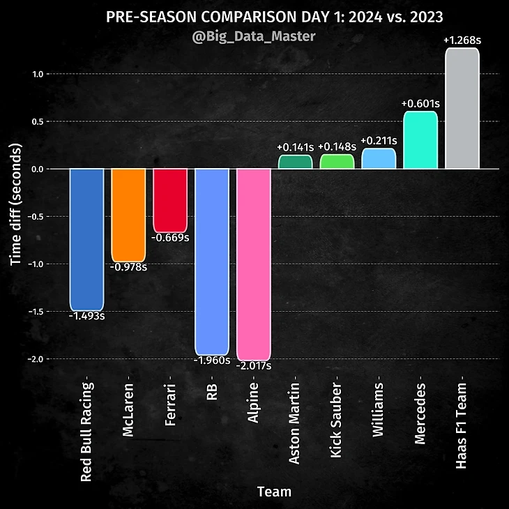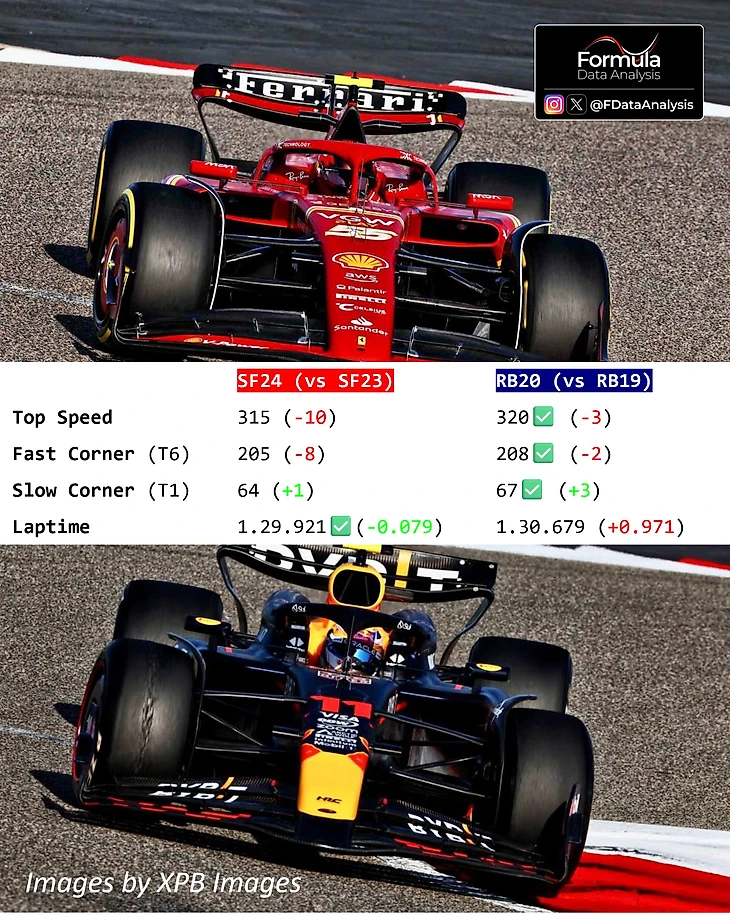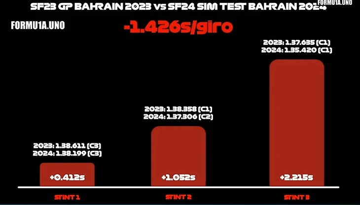 По трассе катается один Пиастри - наверстывает упущенные круги для «Макларена» после утренней поломки у Норриса. А мы с вами пока взглянем на инфографику, составленную порталом Formu1a.uno. Это сравнение темпа «Феррари» на нынешних тестах с темпом на прошлогоднем Гран-при Бахрейна. Уже сейчас заметен прогресс Скудерии. SF-24 в среднем быстрее прошлой версии на 1,426. Неужели в Маранелло действительно хорошо поработали?