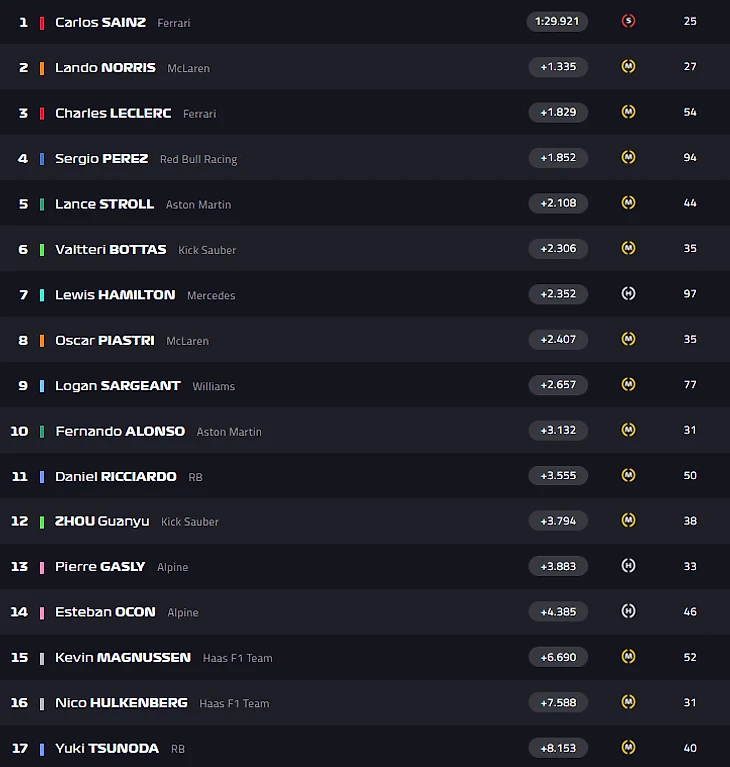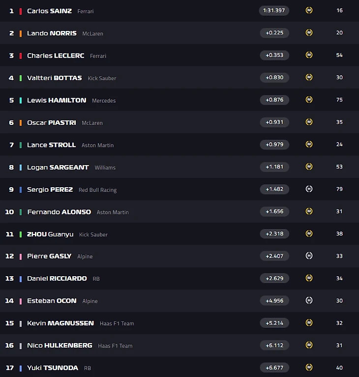 Карлос взял более мягкий комплект С4 и увеличил отрыв от Норриса до 0,936 секунд. Пилот «Феррари» вышел из 31 секунды, поставив время 1.30,686. Это даже лучше вчерашнего круга Макса - хотя опять, испанец был на мягкой резине.