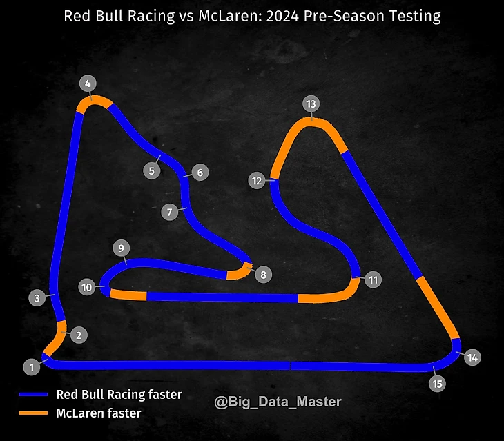 Вот все, что вам нужно знать о тестах. Аналитики сравнили вчерашние времена SF-24 и RB20 с результатами их прошлогодних версий в квалификации Гран-при Бахрейна. «Феррари» проехала быстрее на пару сотых, а вот «Ред Булл» уступил предшественнику почти секунду. Но посмотрите на детали! Скудерия стала значительно медленнее в быстрых поворотах (судя по данным из шестого поворота) и потеряла в максимальной скорости 10 км/ч! «Ред Булл» тоже в минусе - но куда меньше. Более того, «быки» неплохо прибавили в медленных поворотах - и здесь SF-24 вновь отстает от конкурентов. Короче, на тестах чемпионы просто проверяли работу новой концепции, которая, видимо, полностью начнет раскрываться на первом этапе сезона. Есть ощущение, что это будет жесткое доминирование.