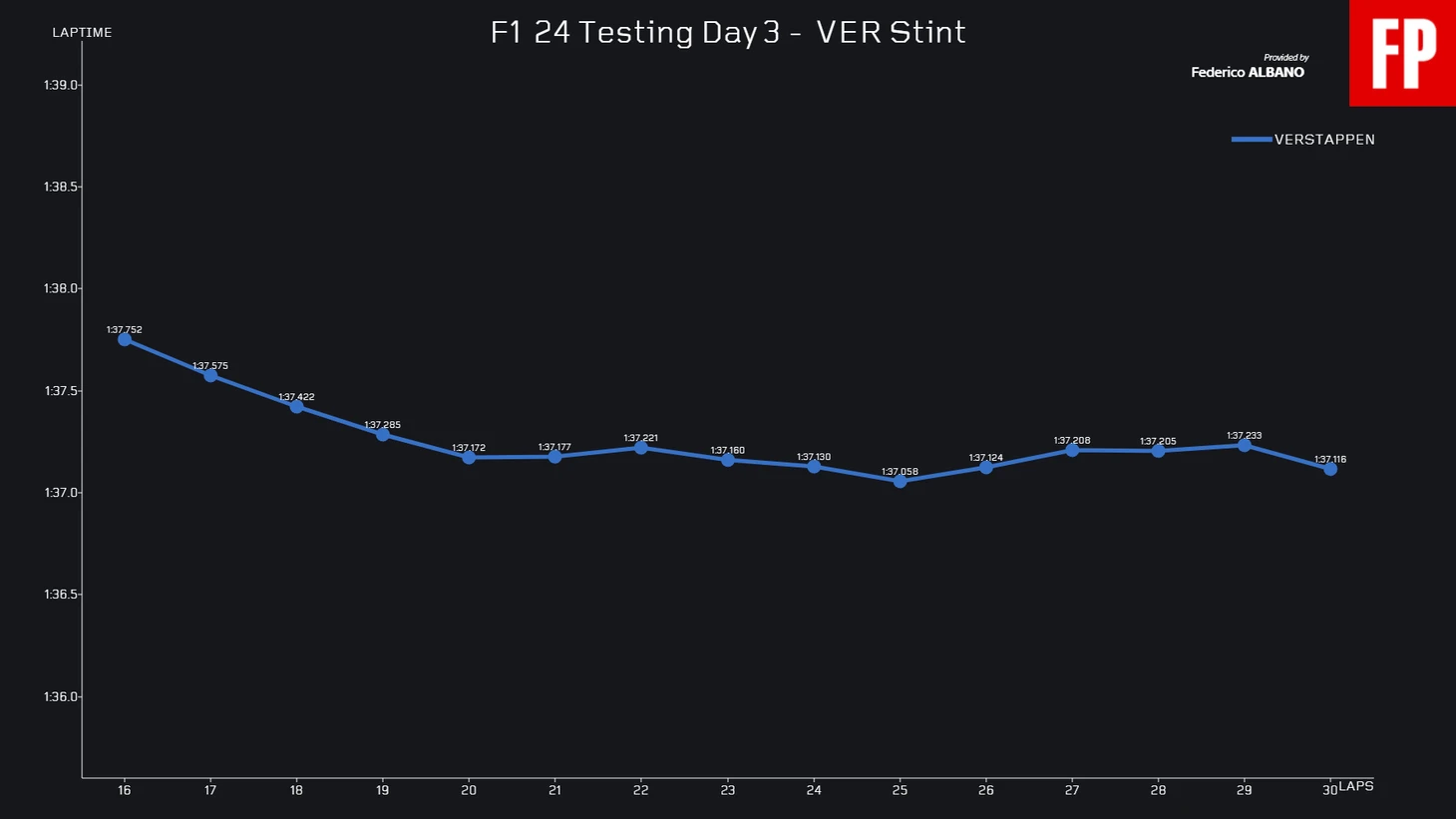 Тут подъехала инфографика от итальянского эксперта Федерико Альбано с временами Макса на протяжении 15 кругов - данные с сегодняшних тестов. Ферстаппен проехал отрезок со средней нагрузкой, и это не была симуляция гонки. Но даже так стабильность, с которой ехал №1, поражает.
