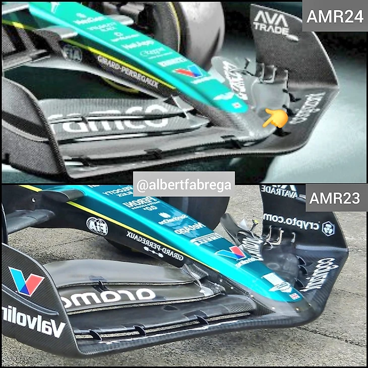 Тренд на огромные куски непокрашенного карбона до «Астон Мартин» не дошел. Команда продолжает крайне грамотно и умеренно использовать данный прием для снижения массы болида. Уступки углепластику с 2023-го минимальны – зеленый на носовом обтекателе отступил на дюйм, а также исчезла черная краска, что фактически не повлияло на образ.