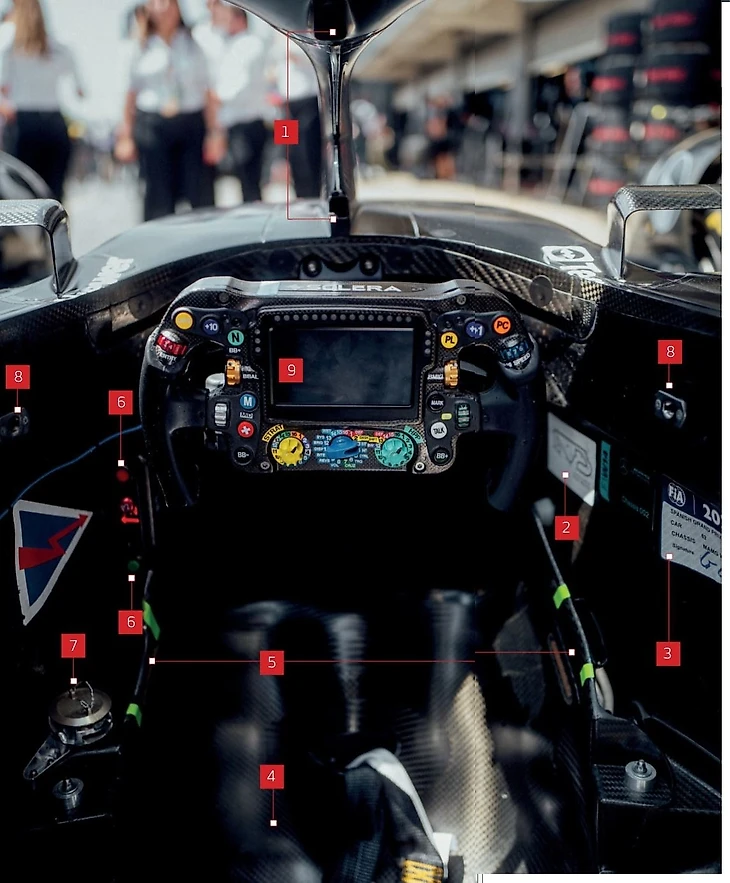 В кокпите две камеры направлены на гонщика, обе встроены в структуру Halo. С верхней нет трансляции, ее могут видеть только в FIA, если им надо посмотреть повтор инцидента, так что она установлена в целях безопасности. Та, что внизу, используется во время трансляций, но время гонки вы не думаете о ней, находясь за рулем.