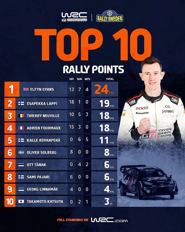 Пилот «Хендэ» Эсапекка Лаппи получил за победу всего 19 очков: 18 баллов за лидерство в конце субботы и один за седьмое время в воскресенье. В то же время ставший вторым Элфин Эванс из «Тойоты» набрал на 5 очков больше – благодаря удачному воскресенью.