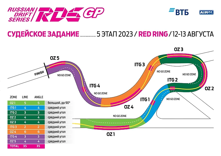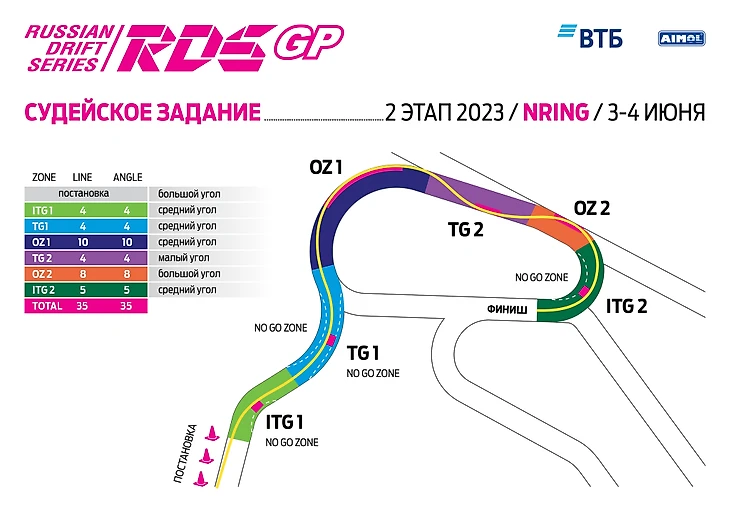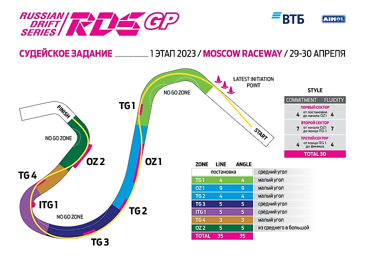 Судья траектории, если брать наш пример первого этапа RDS GP, имеет на старте заезда 35 баллов. Оценивая такие критерии, как глубина заполнения внешних клиппинг-зон (OZ), внутренних клиппинг-пойнтов (ITG), зон «тач-энд-гоу» (TG), соблюдение ограничений «ноу-гоу» зон и границ гоночной дорожки, он определяет, сколько вычесть из этих 35 баллов за допущенные пилотом помарки.