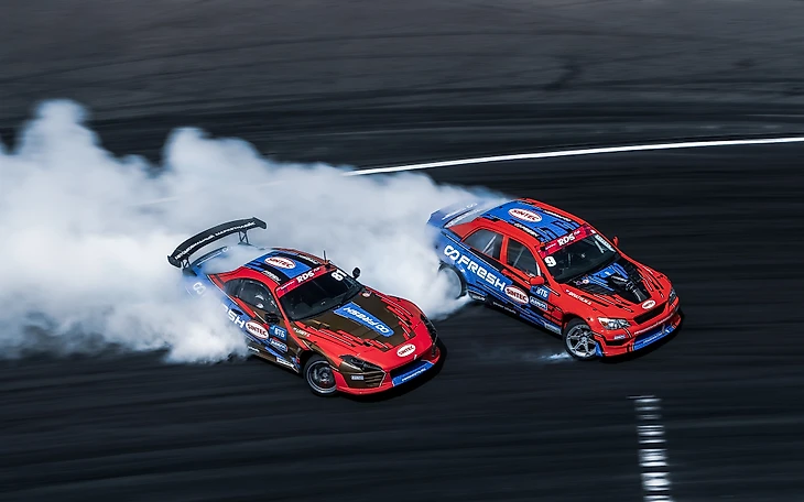 Парные заезды – это основная часть соревнования. В ней участвуют только пилоты, прошедшие квалификацию. Для каждой пары спортсменов проводится хит (серия из двух заездов): сначала один пилот едет в роли лидера, а второй его преследует; затем во втором заезде они меняются ролями. Задача лидера – проехать четко по квалификационному заданию, но не мешать преследователю. Преследователь же должен синхронно повторять движения и траекторию лидера, находясь как можно ближе к нему, но не обгоняя его. Обгоны в дрифте запрещены.