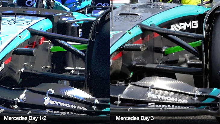 Скорее всего, дело в новом поиске баланса из-за очередной версии аэроконцепции и подвесок. На следующий день «Мерседес» выехал с новой системой расположения пилонов, удивившей всех – c невиданным углом уклона для поглощения части энергии.