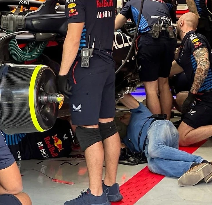 Под «быка» Переса лично залез Эдриан Ньюи, чтобы оценить, насколько мексиканец повредил творение, над которым инженер трудился всю зиму. Увидеть главного конструктора под днищем болида в наши дни - картина весьма неординарная. Осмотр прошел положительно, и к рестарту сегмента машина была полностью восстановлена.