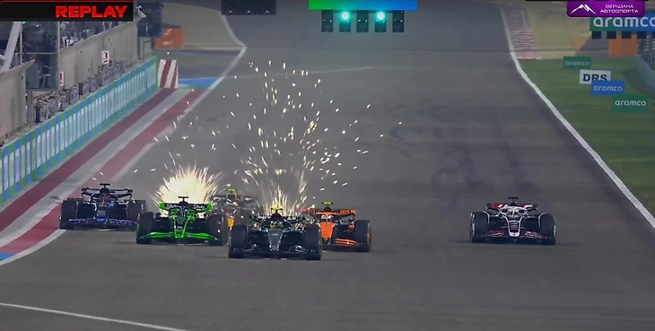 За полчаса до финишного флага четверга тренироваться начали не только пилоты, но и организаторы. Над треком последовательно включили режимы виртуального пейс-кара, машины безопасности и красных флагов. Вся индикация на автодроме сработала успешно, так что через 5 минут пилоты вновь появились на трассе. И показали настоящее шоу, по которому все загрустили за межсезонье. Первый круг после возобновления сессии пилоты проехали вместе, а на стартовой прямой устроили настоящий старт с хода. Хэмилтон, Норрис, Перес, Боттас, Магнуссен, и Окон, выбивая снопы искр, пронеслись по первому сектору «Сахира», имитируя настоящую битву. Импровизация прошла успешно - пилоты действовали в меру агрессивно и сохранили новые машины в целости.
