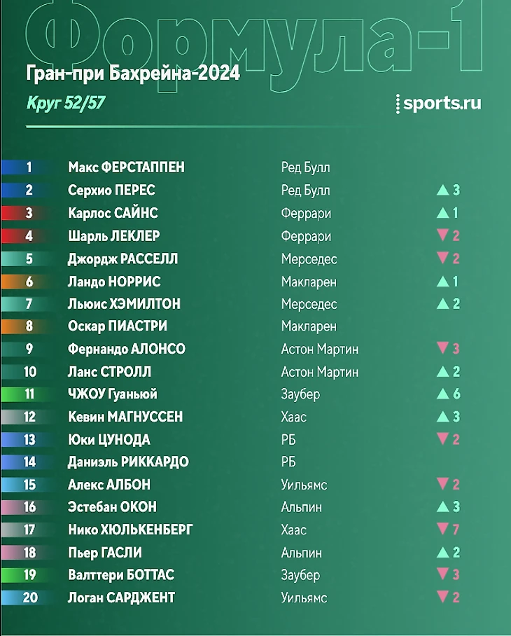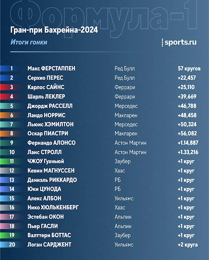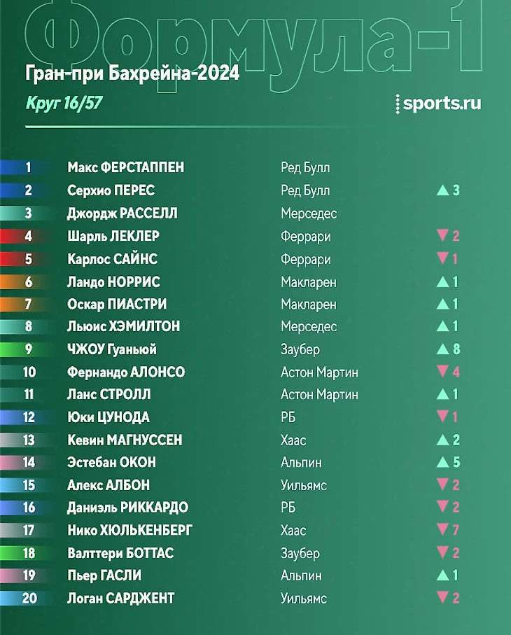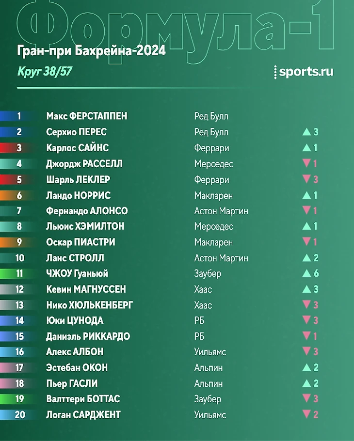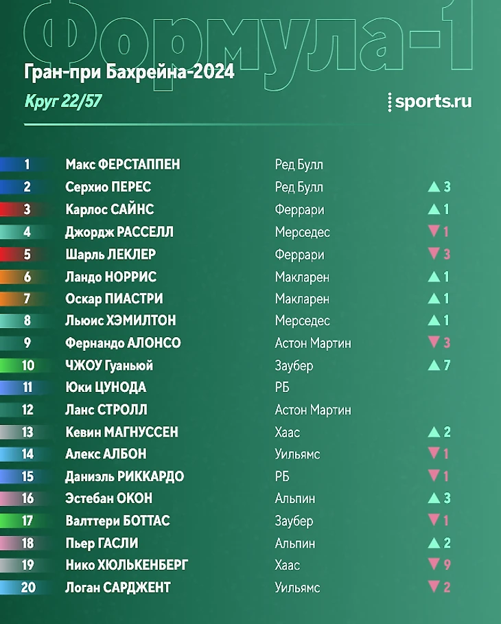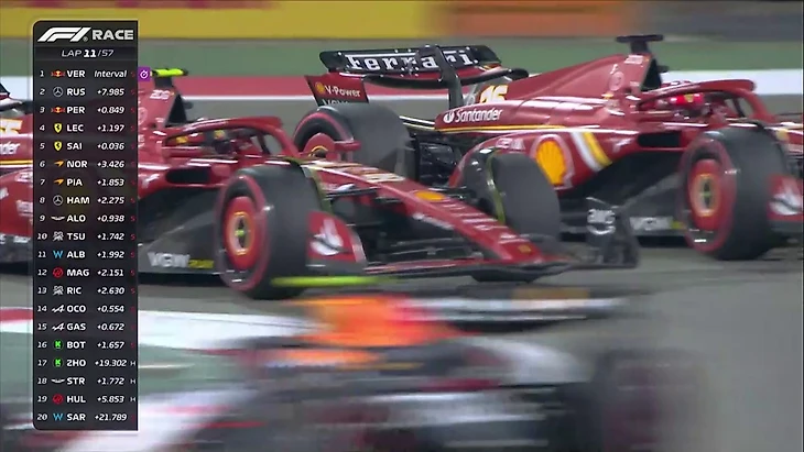 Позади 23 круга. Макс уехал от Переса на 10 секунд, тот опережает Сайнса на 2 секунды, до Расселла еще 5 секунд. Далее примерно на одинаково расстоянии друг от друга (в 2,5 секунды) едут Леклер, Норрис, Пиастри и Хэмилтон.