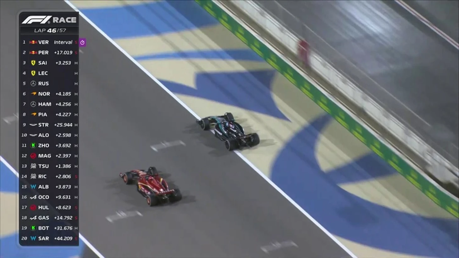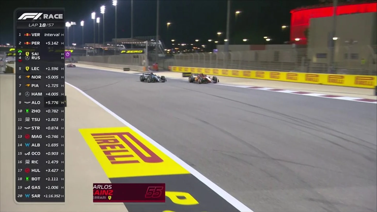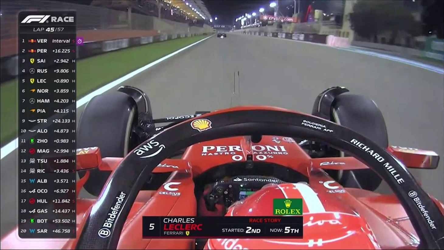 Позади 23 круга. Макс уехал от Переса на 10 секунд, тот опережает Сайнса на 2 секунды, до Расселла еще 5 секунд. Далее примерно на одинаково расстоянии друг от друга (в 2,5 секунды) едут Леклер, Норрис, Пиастри и Хэмилтон.