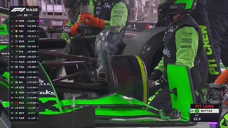 К слову о пит-стопах. Только что гонка для Боттаса фактически закончилась. Из-за проблемы с домкратом Боттас провел на пит-стопе почти 20 секунд и вернулся на трассу предпоследим. Позади - только Сарджент, который ранее ошибся на торможении и чуть не заглох.