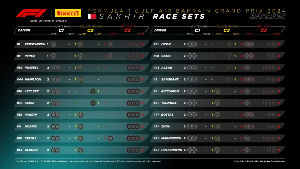 (Дельту между красным «софтом» и желтым «медиумом» производитель по данным практик оценил в 1,2 секунды, а разрыв от среднего состава до самого жесткого – уже в 0,3 секунды с круга. Свежий «софт» при этом оставался только у Ферстаппена, Переса и Хюлькенберга из обитателей топ-10 – причем у «Феррари» не оказалось даже нового «медиума»).