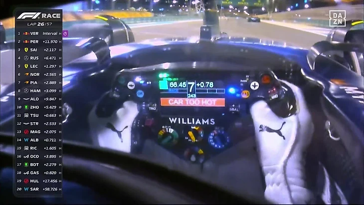 На 25-м круге Хэмилтон пожаловался на сломанное сиденье! Что-то новенькое. Тем временем на руле Албона тоже появились уведомления о перегреве мотора «Мерседеса».
