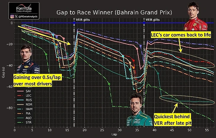 Рисунок 5, Гран-при Бахрейна. Это график дельты прохождения дистанции к победителю. Если темп равный, график будет горизонтальный, если начнет подниматься - темп выше. Если мы смотрим относительно другого пилота, то равенство темпа - линии параллельны. Цитирую: "А на второй вообще-то его темп был вполне стабилен – на уровне «Ред Булл»!". Вообще-то нет, линия Леклера идет вниз по отношению к Ферстаппену. Но почти параллельно линии Переса, хотя вниз идет быстрее. Вот Сайнс идет в темпе Переса, это да.