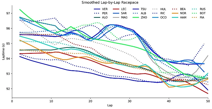 Проблема – и сложности с прогревом в необычных условиях, и трафик, и необходимость обгонять соперников. Ведь Ферстапп всю гонку проводит в чистом воздухе и почти без необходимости разбираться с кем-либо после пит-стопов – потому немного экономит и время, и ресурсы. Это чисто лидерский дивиденд, который вносит небольшое искажение в общую картину, но довольно сильно влияет на расстановку, если парня впереди реально никто не подгоняет, а спереди – не сдерживает: его темпы на кругах становятся немного оторванными от остального пелотона. Леклера, например, еще сдержала стартовая борьба с Пересом, которая явно не помогла с поддержанием комфортного состояния шин: пока Макс спокойно контролировал темп и загрузку покрышек, Шарлю пришлось сразу же гоняться и налагать на них дополнительный стресс.