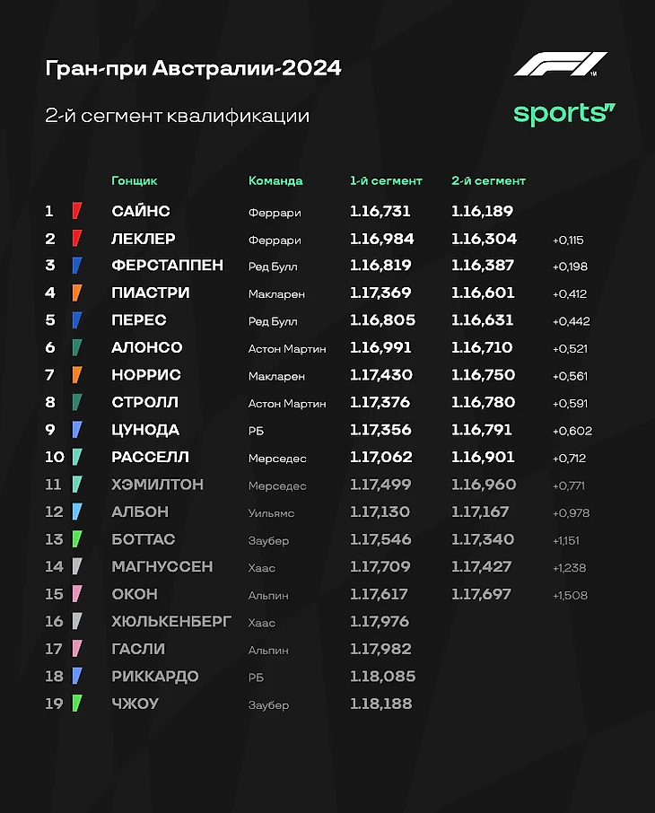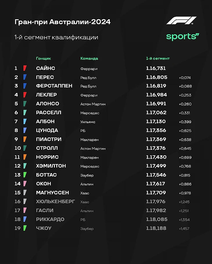 Сайнс - лидер, он в 0,2 секунды впереди Макса и в 0,380 впереди Леклера. Неплохо так Карлос выглядит после операции.