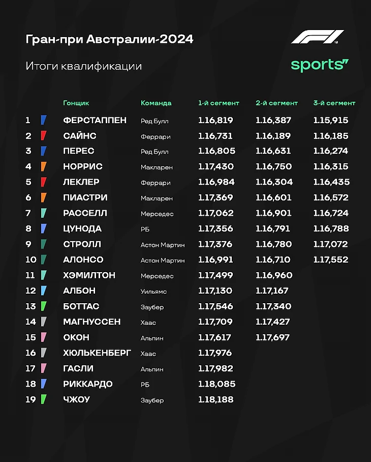 - Ферстаппен вновь всех уничтожил, несмотря на прогнозы в пользу «Феррари». Конечно, у «Ред Булл» до этого были проблемы с поиском настроек - но это ожидаемо. RB20 максимально радикален, так что команда может и промахиваться при работе с ним. Однако на скорость это в итоге несильно влияет. - Более того, во многом здесь спасает Макс. Скорее всего, преимущество в квалификации - чистый скилл №1, что объясняется трассой. «Альберт-парк» требователен к пилотажу и концентрации гонщика, особенно это заметно при порывах ветра. Поэтому гоняться здесь приходится на грани. Просто посмотрите, как ехал Карлос Сайнс (на фото ниже). - К слову о Сайнсе, испанец провел феноменальную квалификацию. Он только вернулся в гонки после операции из-за аппендицита, а уже смог попасть на первый ряд. При этом Карлос утверждал, что пока не восстановился на 100% - но тем не менее с каждым днем он чувствует себя все лучше и лучше. Может, завтра удастся провести выдающуюся гонку? - «Мерседес» вновь без скорости. И дело не только в проблеме в скоростных поворотах и в подборе настроек. W15 резко теряет темп при усложнении условий. Достаточно усилиться порывам ветра, и болид потеряет всякую стабильность во временах. И самое печальное для команды - это то, что найти хотя бы направление для решения проблем пока не удается. - «Макларен» смог хорошо прибавить. Во многом это объясняется трассой, где не так много медленных поворотов, с которыми у болида проблемы. Еще перед гонкой Ландо Норрис отмечал, что третий сектор «Альберт-парка» - самый проблемный для MCL38. Команда смогла показать хороший результат и, судя по всему, станет третьей силой в гонке. - Отметим хорошее выступление Юки Цуноды - японец действительно здорово справляется с болидом «РБ» (даже выбил Льюиса Хэмилтона из топ-10). Было бы интересно посмотреть, что показал бы Риккардо во втором сегменте, но удаленный круг не вернешь. - Также не забудем про одиночку Албона, который в этот уик-энд тащит весь «Уильямс» на себе (иронично, что из-за своей же ошибки). В какой-то момент Алекс, казалось, был близок к попаданию в третий сегмент - но темпа не хватило. Хотя12-е место - уже хороший результат для «Уильямса». Главное теперь - попасть в очки завтра.