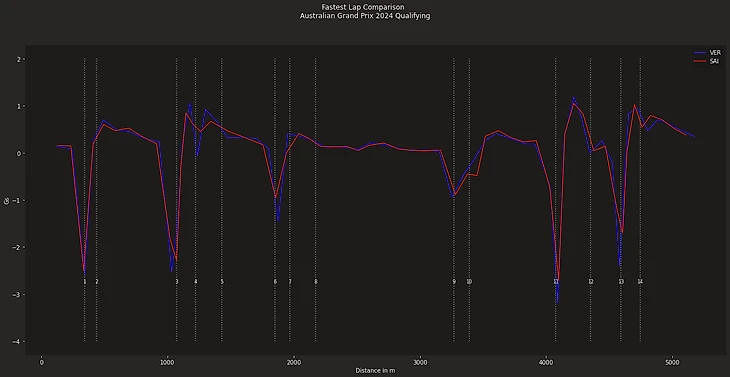 По оси у показана перегрузка, которую испытывал, каждый гонщик, по оси х - отложена дистанция трассы. Вертикальными линиями показаны номера соответствующих поворотов. Синим цветом показан график - Макса Ферстаппена, а красным соответственно Карлоса Сайнца.